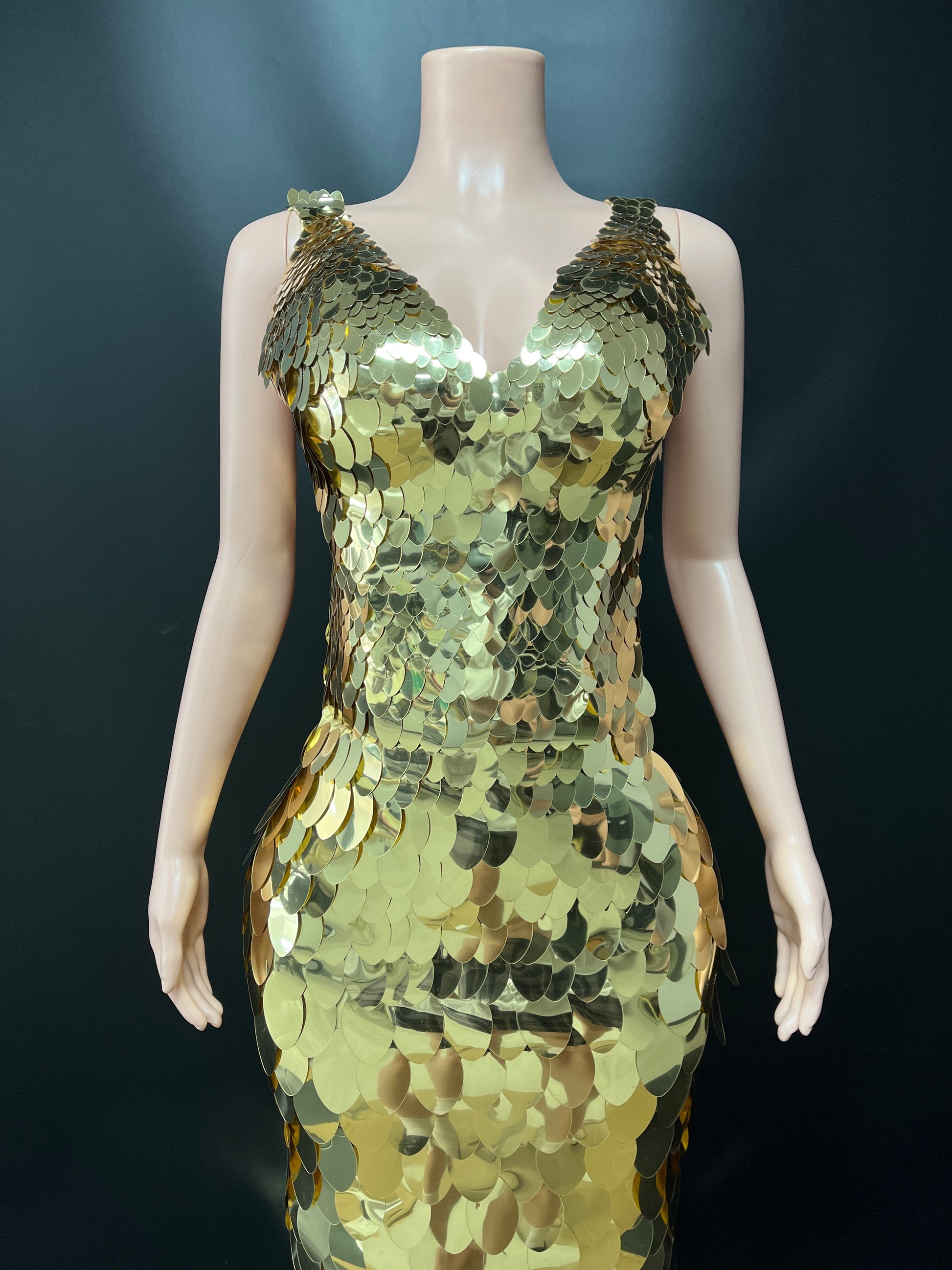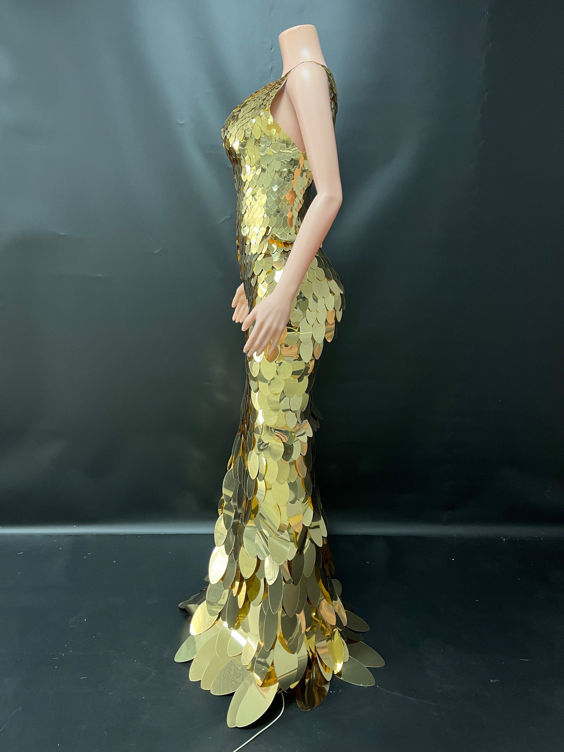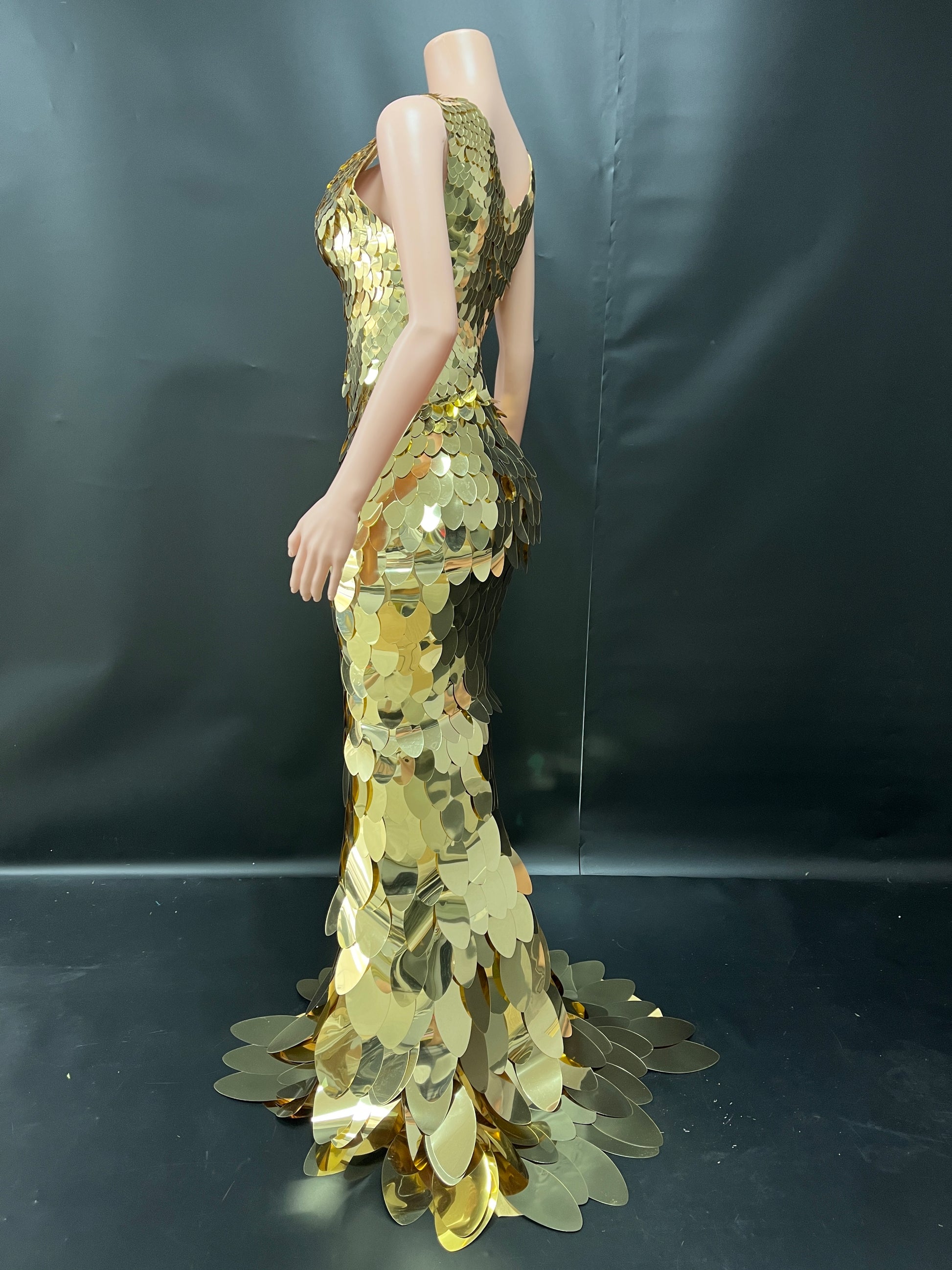 Dazzle the room in the golden siren gown A breathtaking body hugging masterpiece designed to command attentions crafted with oversize reflecting goal seeking that cascade like shimmering fish scale this dress exudes luxury and power with every moment it’s sculpt to fit extenuates your curves while dramatic, mermaid flare adds regal finish perfect for gala red carpet or any events where you want to look unforgettable.
