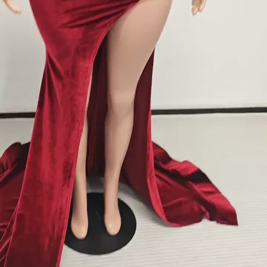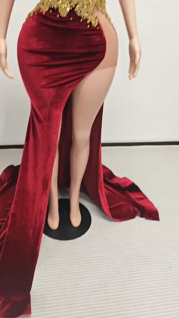 Command every room in the Scarlet Empress Dress Crafted from rich velvet with a darling high slit this dress blends classic elegance and bold allure.perfect for galas ,special occasions and unforgettable nights it’s a statement piece made for a queen
