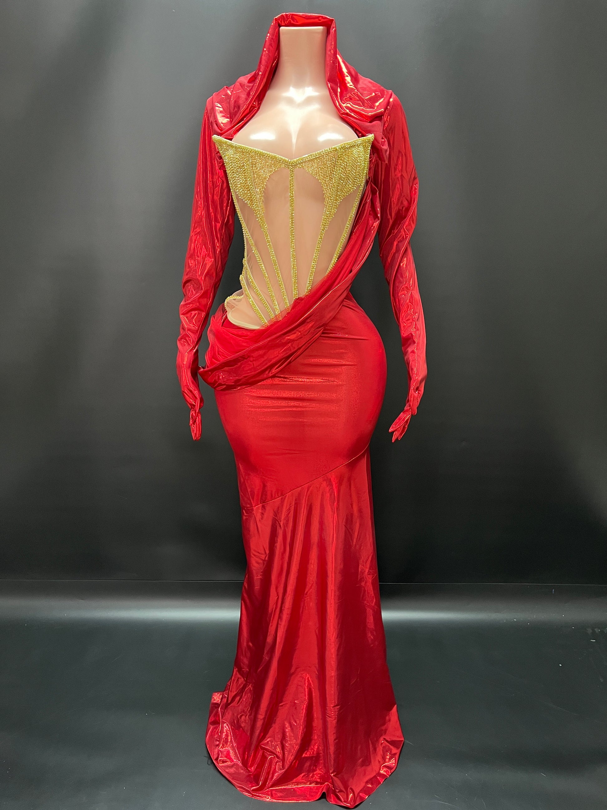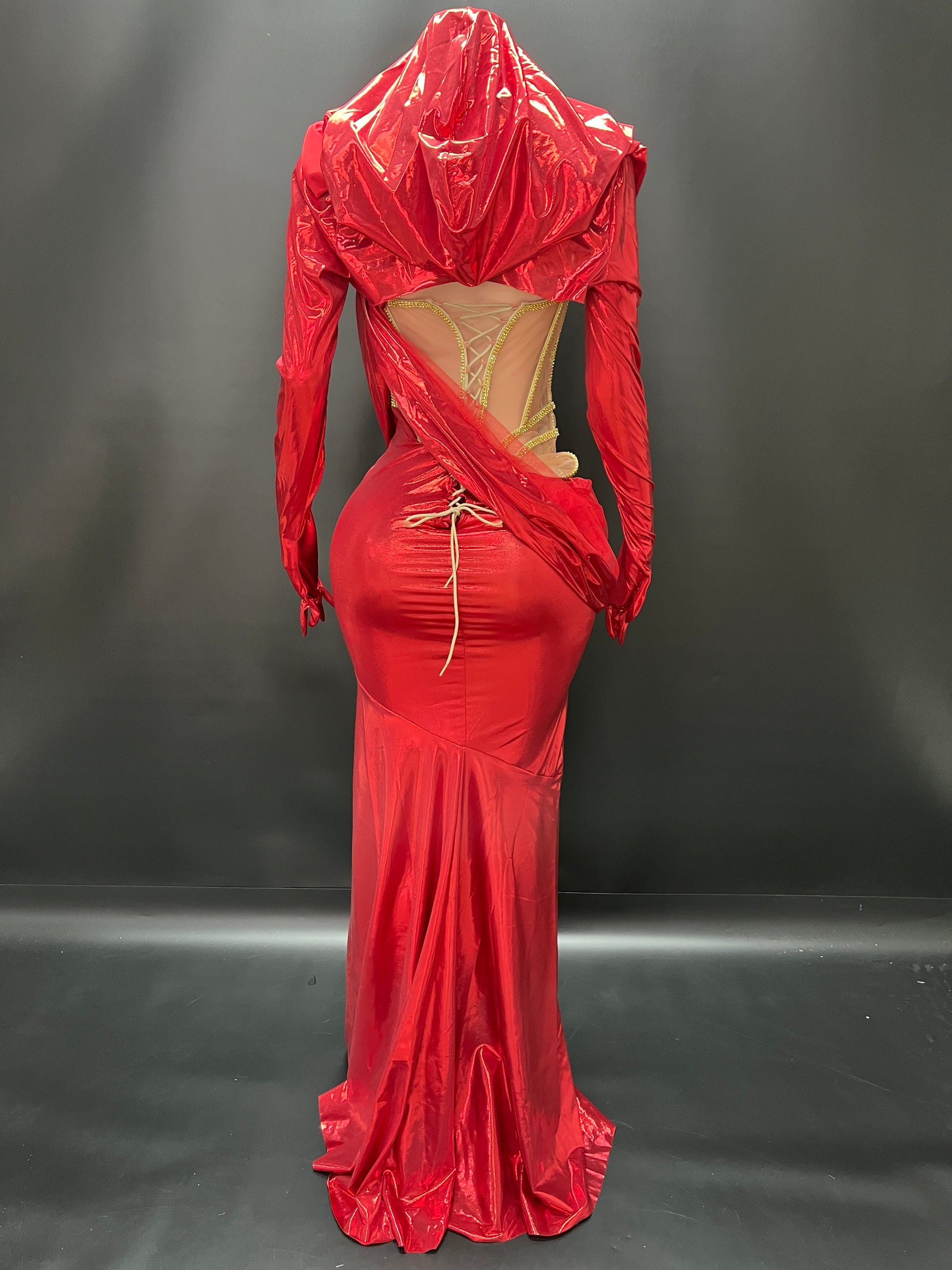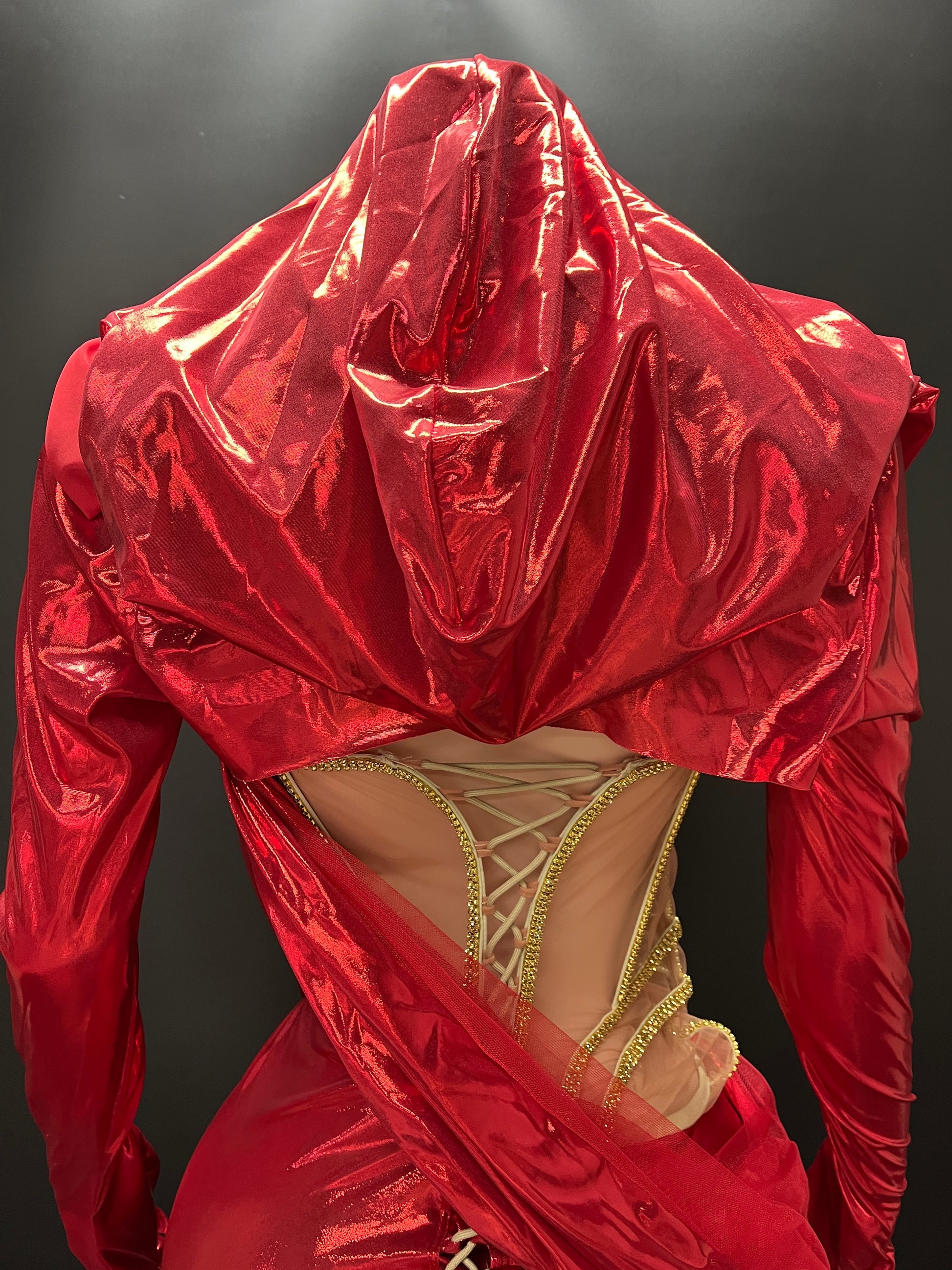 The Middle East Dress is a masterpiece of power and allure. Crafted in radiant red with golden metallic tones this long sleeve dress features a dramatic hoodie for a mysterious,regal edge. Luxurious silhouette captures both elegance and strength, making it perfect for galas high fashion events and unforgettable entrance.