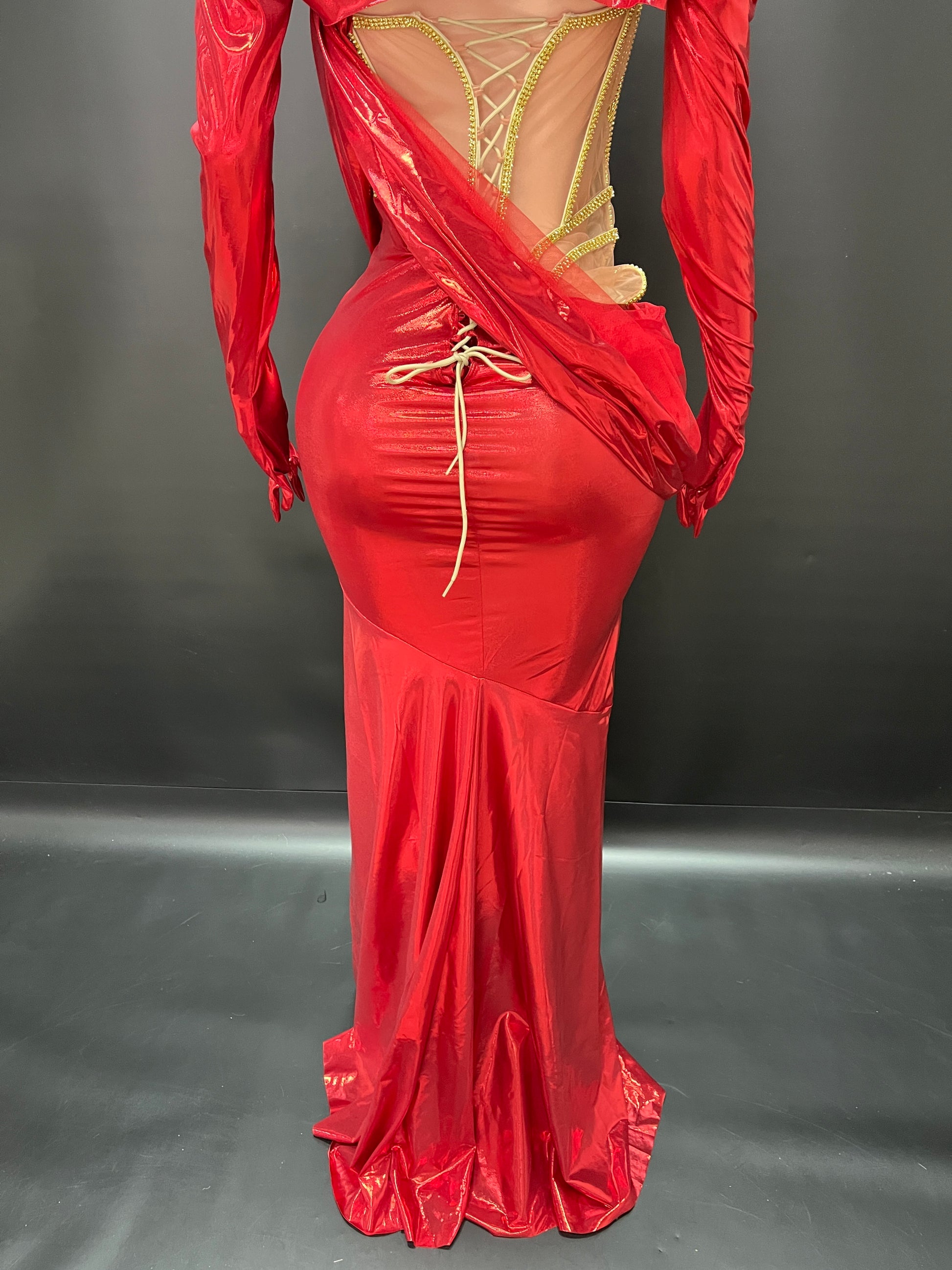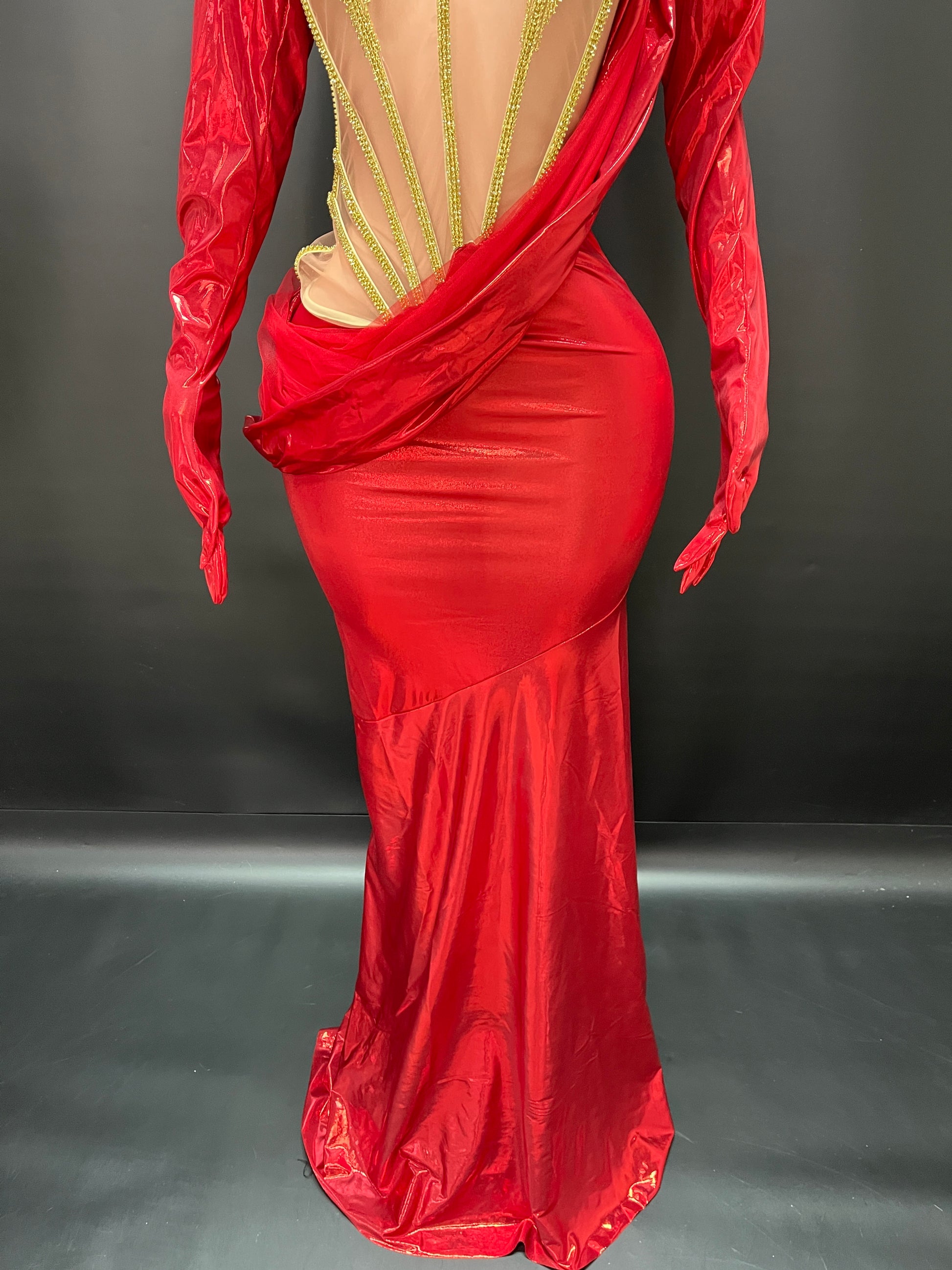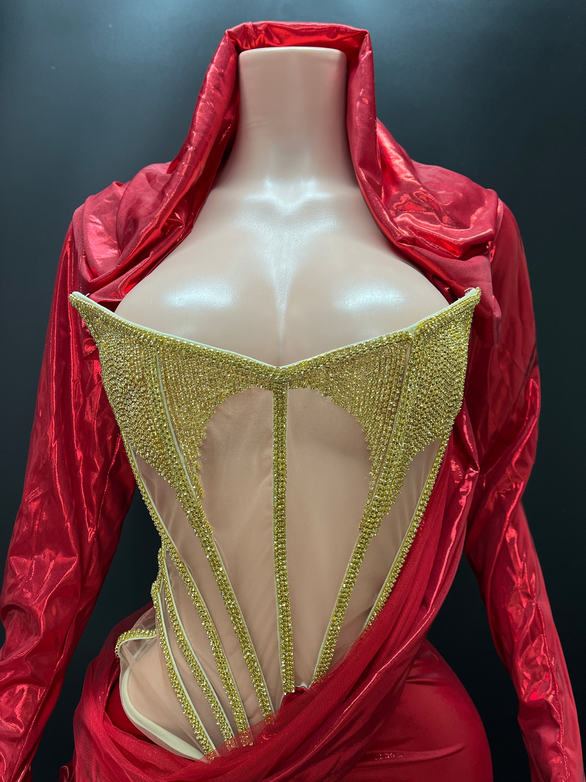 The Middle East Dress is a masterpiece of power and allure. Crafted in radiant red with golden metallic tones this long sleeve dress features a dramatic hoodie for a mysterious,regal edge. Luxurious silhouette captures both elegance and strength, making it perfect for galas high fashion events and unforgettable entrance.