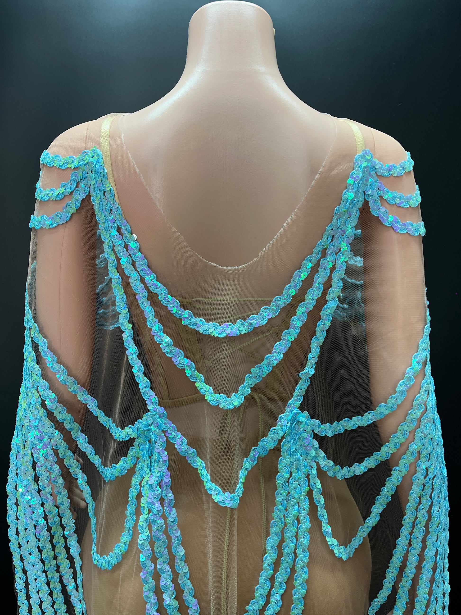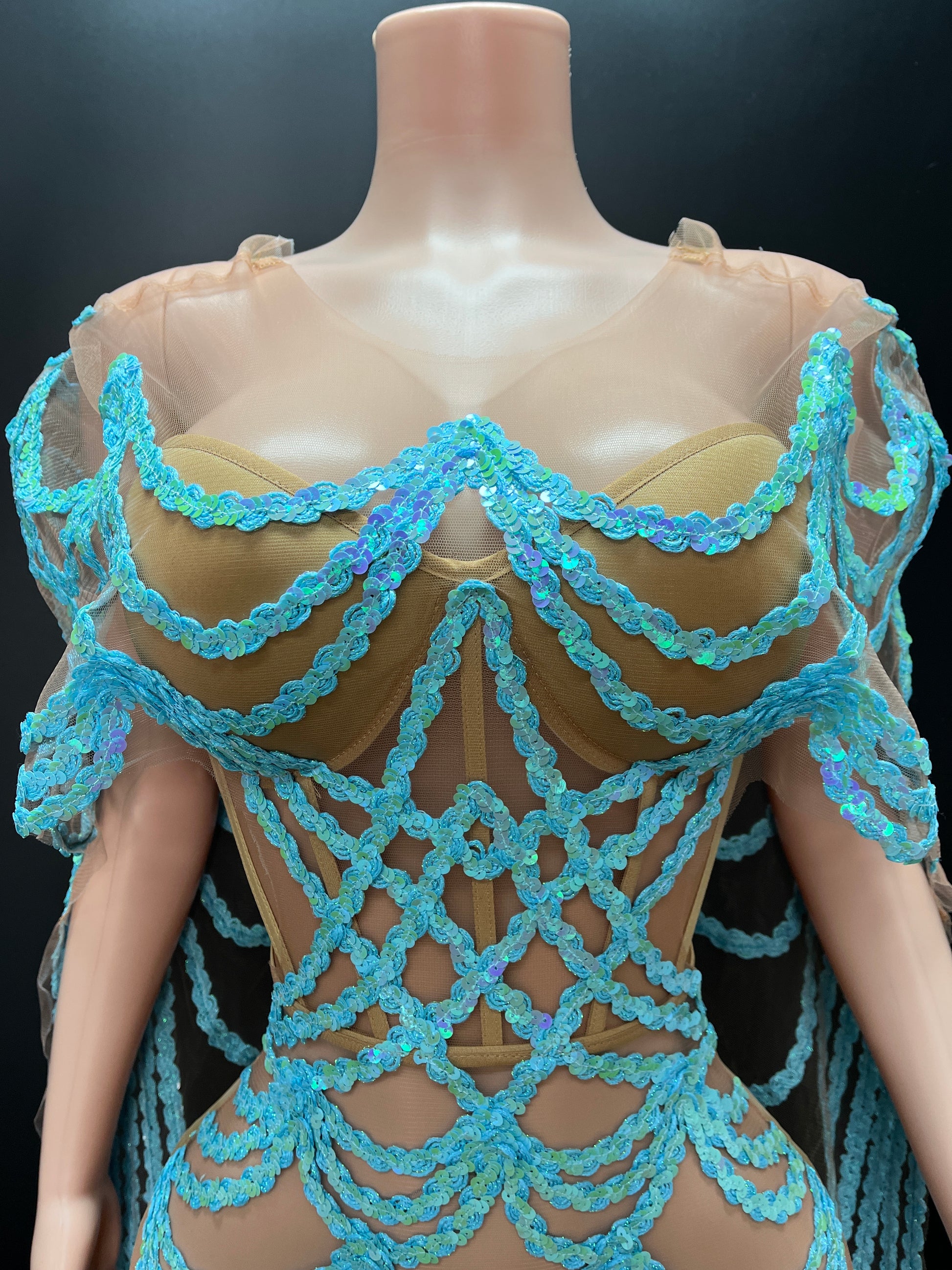 Heads turn in this Ruthless dress a daring masterpiece designed to accentuate every curve crafted with a sheer nude mesh base and layered with cascading turquoise rope detailing, this statement, peace, blends, art, and fashion into one unforgettable look perfect for exclusive nights out, runway inspired parties, or when you want to embody pure confidence and allure.