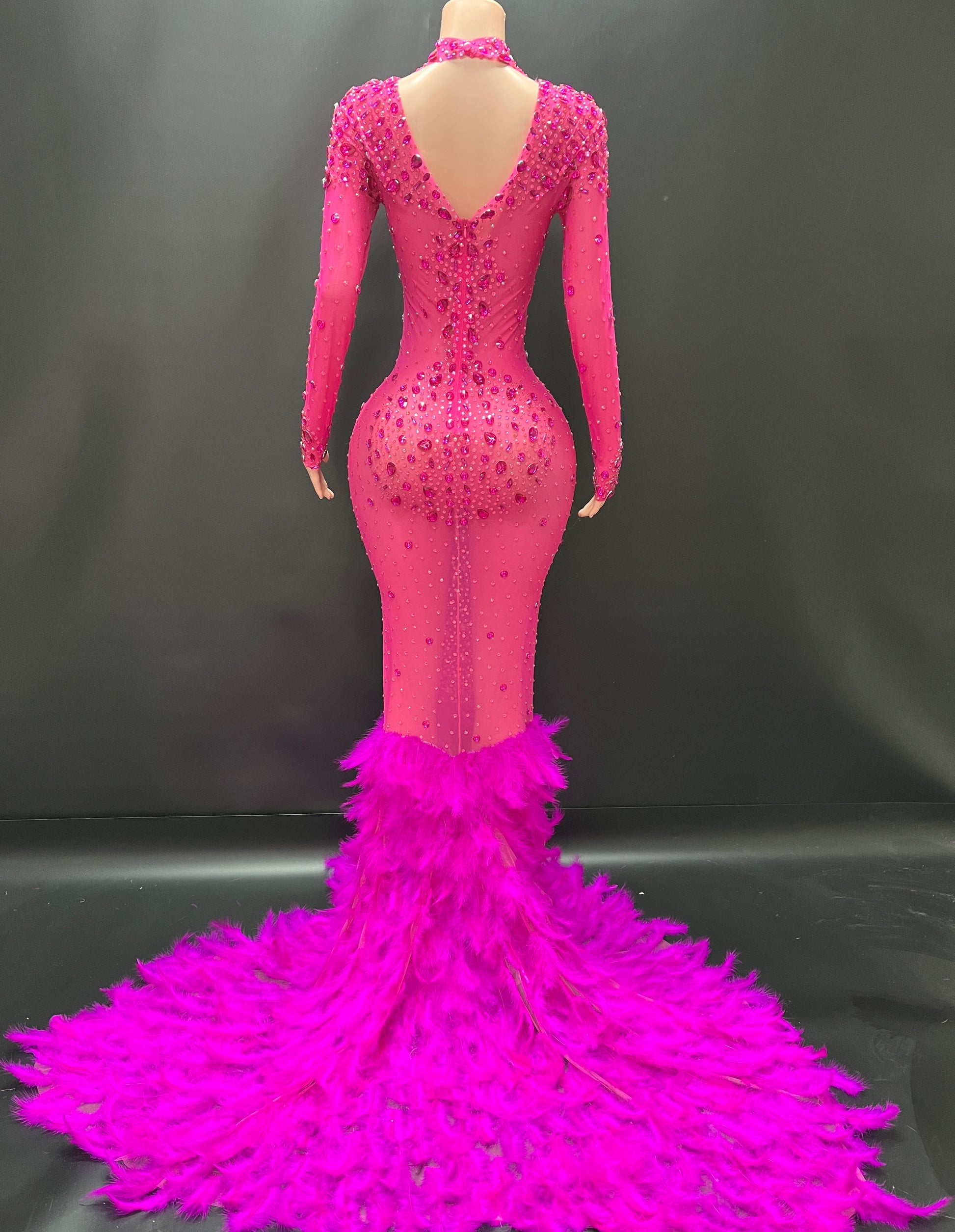 Unleash your inner diva in the fuchsia feather gown, this shows up in masterpiece features a body hugging, silhouette adorn with Dalyn hot pink gemstones cascading into a luxury, feathered, mermaid train bold glamorous, and unforgettable discount is made for Queens, who demand the Spotlight at Gala red carpet, birthdays, or Any, high end events